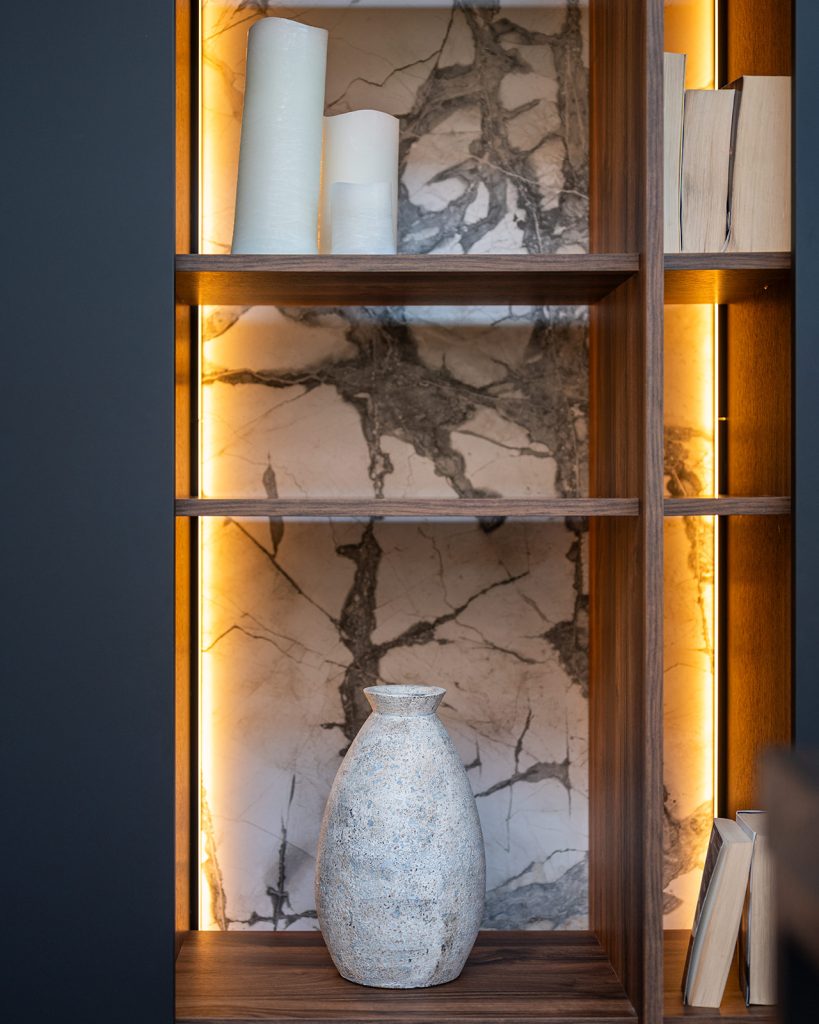 Esta zona esconde detrás de una aparente librería, un mundo de piedras, maderas, colores, materiales y texturas. La elección de éstas, será un reflejo de nuestra personalidad, que desvelarán nuestros gustos, emociones y sentimientos.