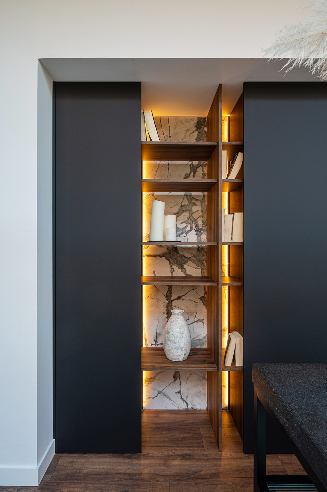 Esta zona esconde detrás de una aparente librería, un mundo de piedras, maderas, colores, materiales y texturas. La elección de éstas, será un reflejo de nuestra personalidad, que desvelarán nuestros gustos, emociones y sentimientos.