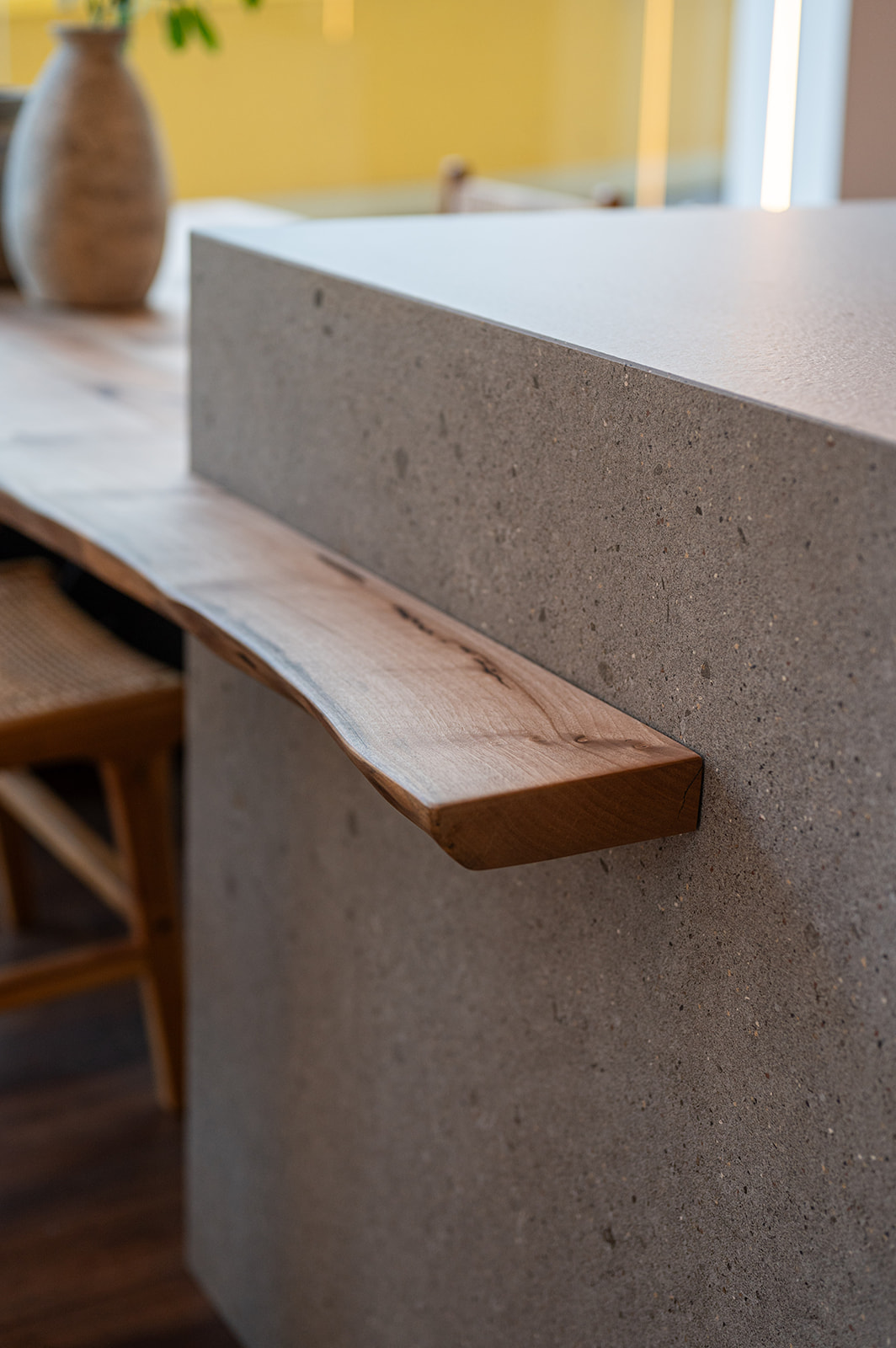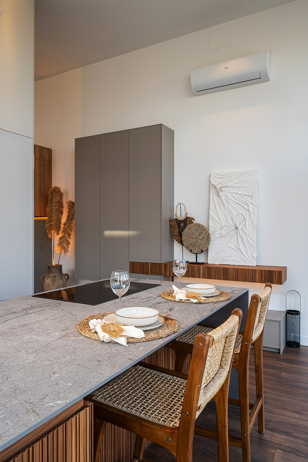 Como protagonista del espacio, tenemos el efecto pétreo, aportando solidez y personalidad, acompañado de la sencillez del mobiliario.